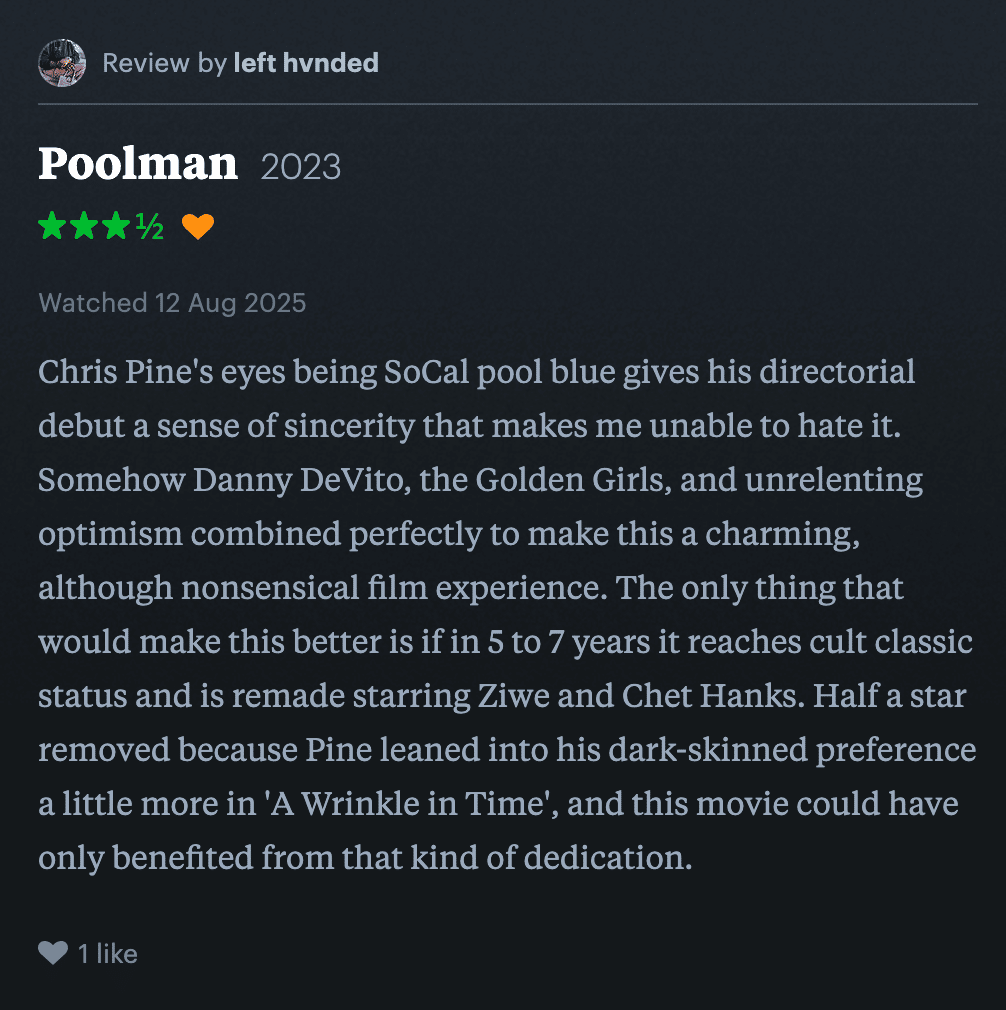 whole film. The ENTIRE time! DeWanda Wise is gorgeous and Danny DeVito leans into a type of chaos that no one else seems to have access to, so visually, that makes up for the fact that Chris Pine looks like a misogynist's cartoon idea of a 2nd wave feminist. I say this affectionately, he is my favorite Chris by far, and I only have room in my heart for one to three men with zoboomafoo eyes, so that's saying... something. A great movie to put on when you want to confuse yourself or others.