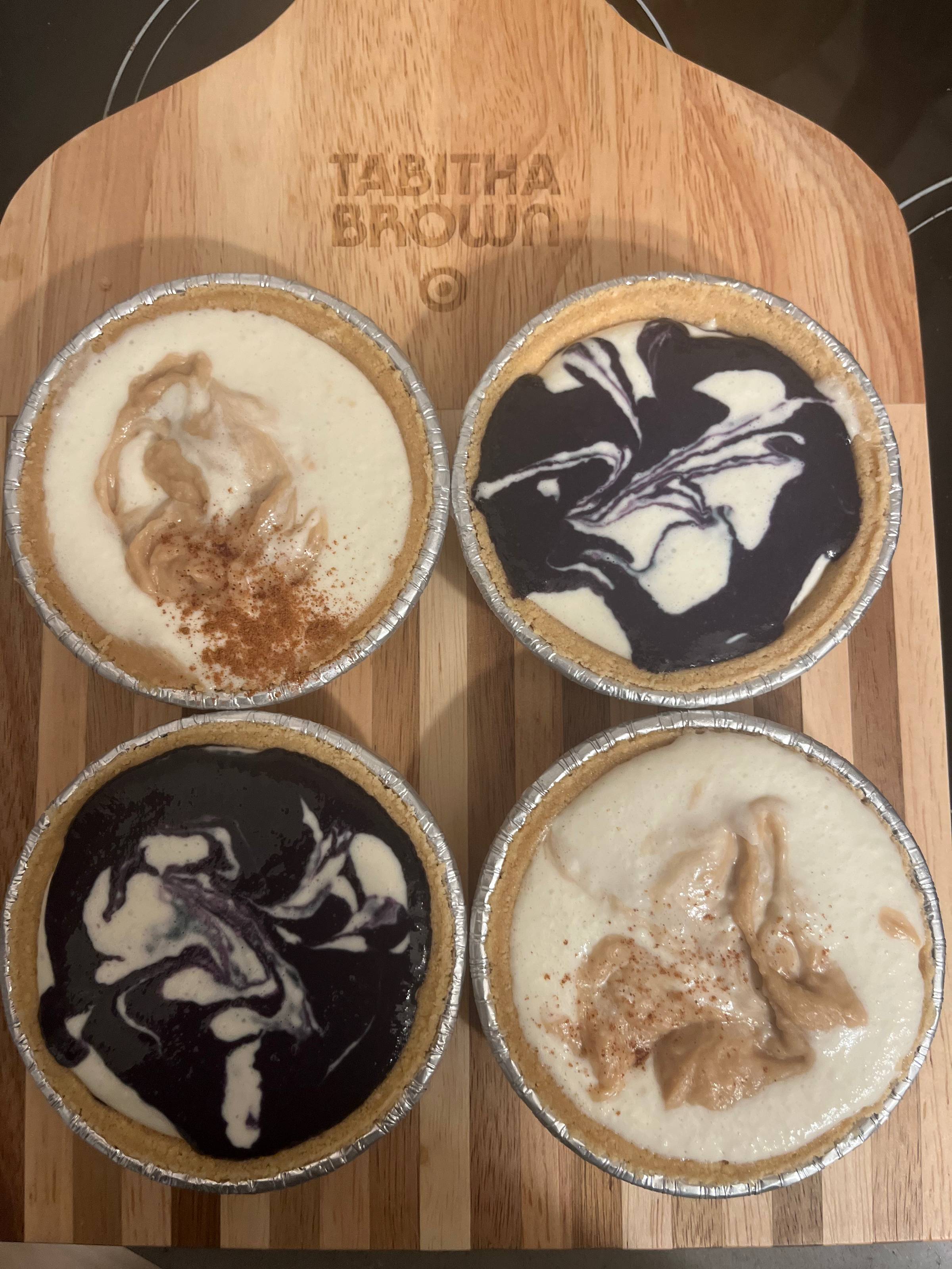 I looked up a cheesecake recipe in anticipation of my birthday, didn't have the right ingredients, said a prayer and honestly it worked out. I gained some arm muscle hand whisking that thing, but the pay off is doubly worth it. These are ube and cookie butter - the cookie butter ones could have been a little smoother, but you live and you learn.